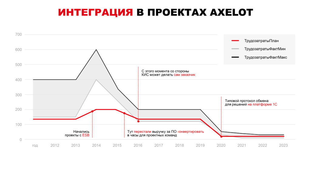 На графике «Интеграция в проектах AXELOT» нарисована кривая, на которой видно плановую оценку трудозатрат, связанных с реализацией обмена между корпоративной системой и решением AXELOT. В 2012 году она составляла порядка 140 часов суммарных трудозатрат. Такой результат специалистов AXELOT не устраивал. Компания искала возможности для того, чтобы оптимизировать эти затраты и повысить точность оценки.